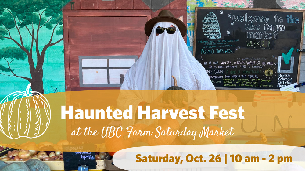 Celebrate Halloween and the late harvest season at UBC Farm’s Haunted Harvest Fest! Join the last special event of our market season for our jack-o-lantern carving contest, apple and roasted squash tastings, Rabbitat’s bunny petting zoo, Golden Rescue golden retrievers, and a spooky forest tour. Explore local vendors, enjoy live music, and grab a bite from the food trucks. For kids there’s face-painting and trick-or-treaters can collect candy throughout the market, and costumes are encouraged!