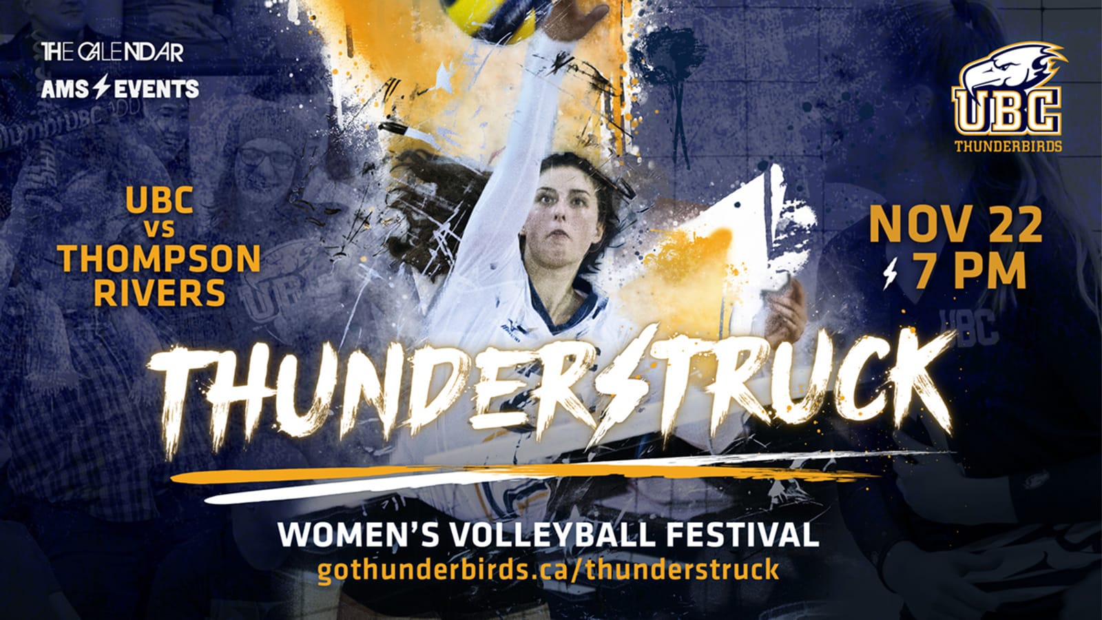 Hey T-Bird Fans! Make sure to keep your schedules clear for this one as THUNDERSTRUCK is one of our largest festival events of the year. Watch our defending National Champions, the UBC Women’s Volleyball team, take on the Thompson Rivers Wolfpack in what is sure to be a SOLD-OUT crowd at War Memorial Gym on Friday, November 22nd!