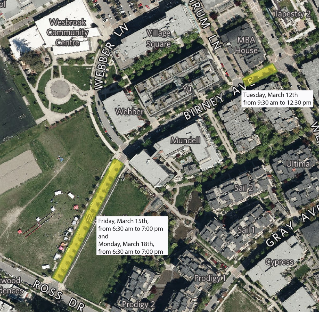 Please note the following road closures to facilitate essential construction work at Wesbrook Place on Birney Avenue:
