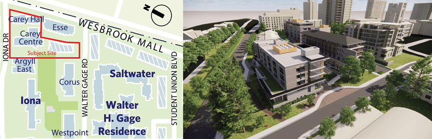 The application includes two new academic/residential buildings to the south and east of the existing Carey Centre. An amendment to the Chancellor Place Neighbourhood Plan is required to realize these expansion plans.