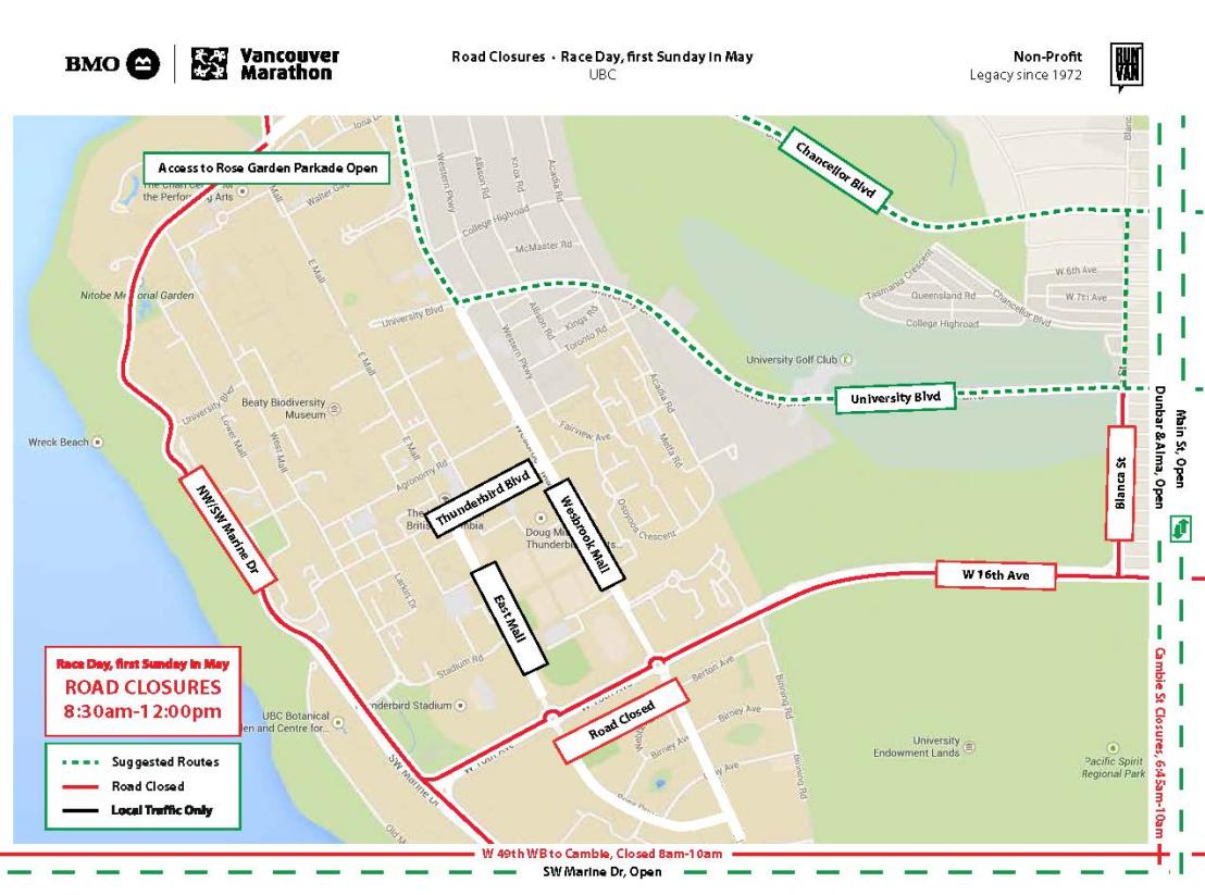 The BMO Vancouver Marathon is taking place on Sunday, May 4, 2025. There will be road closures along the event route throughout the City of Vancouver all morning and early afternoon. Around UBC, road closures will be in effect between 8 a.m. and 12:30 p.m. The organizers are strongly recommending that residents plan ahead and avoid driving during this time, particularly any trips to and from Wesbrook Place from 8:30 a.m. to 11 a.m.