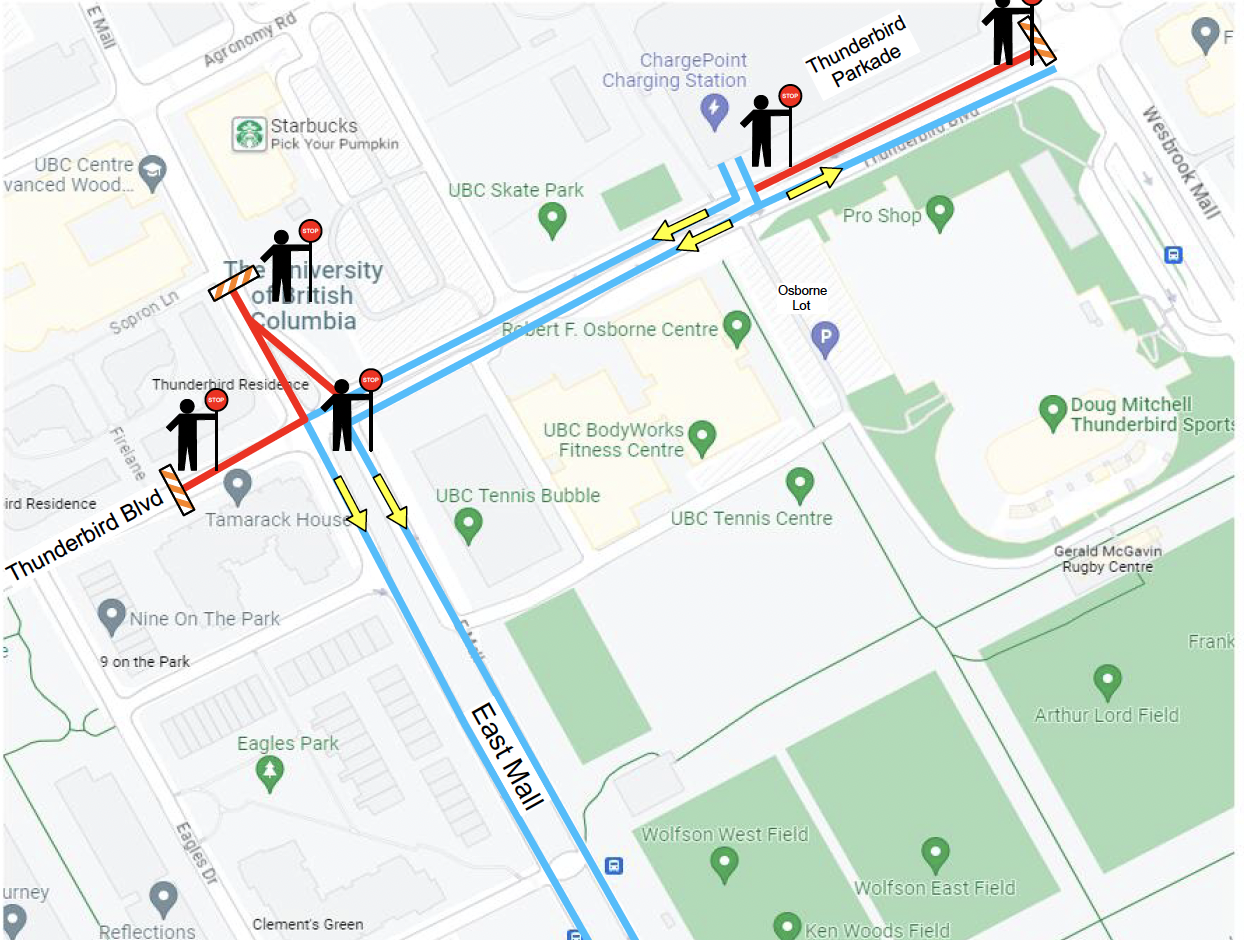 UBC Parking will close roads half an hour before event end times to expedite traffic from Thunderbird Parkade by using the two lane exit plan. Two lanes of traffic will exit the parkade and turn right onto Thunderbird Blvd east and west bound lanes then turn left at East Mall to 16th Ave. East side of East Mall from Thunderbird Blvd to 16th Ave and west side of East Mall from FP Innovations to 16th Ave will be closed to parking starting at 5:00pm on event days.
