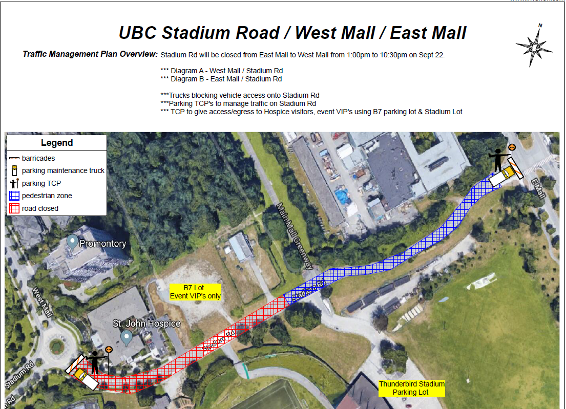 Stadium Road will be closed from East Mall to West Mall from 1 to 10:30 p.m. Access to Hospice to be maintained via West Mall. Access to stadium Road will be limited to VIP parking and vendors.
