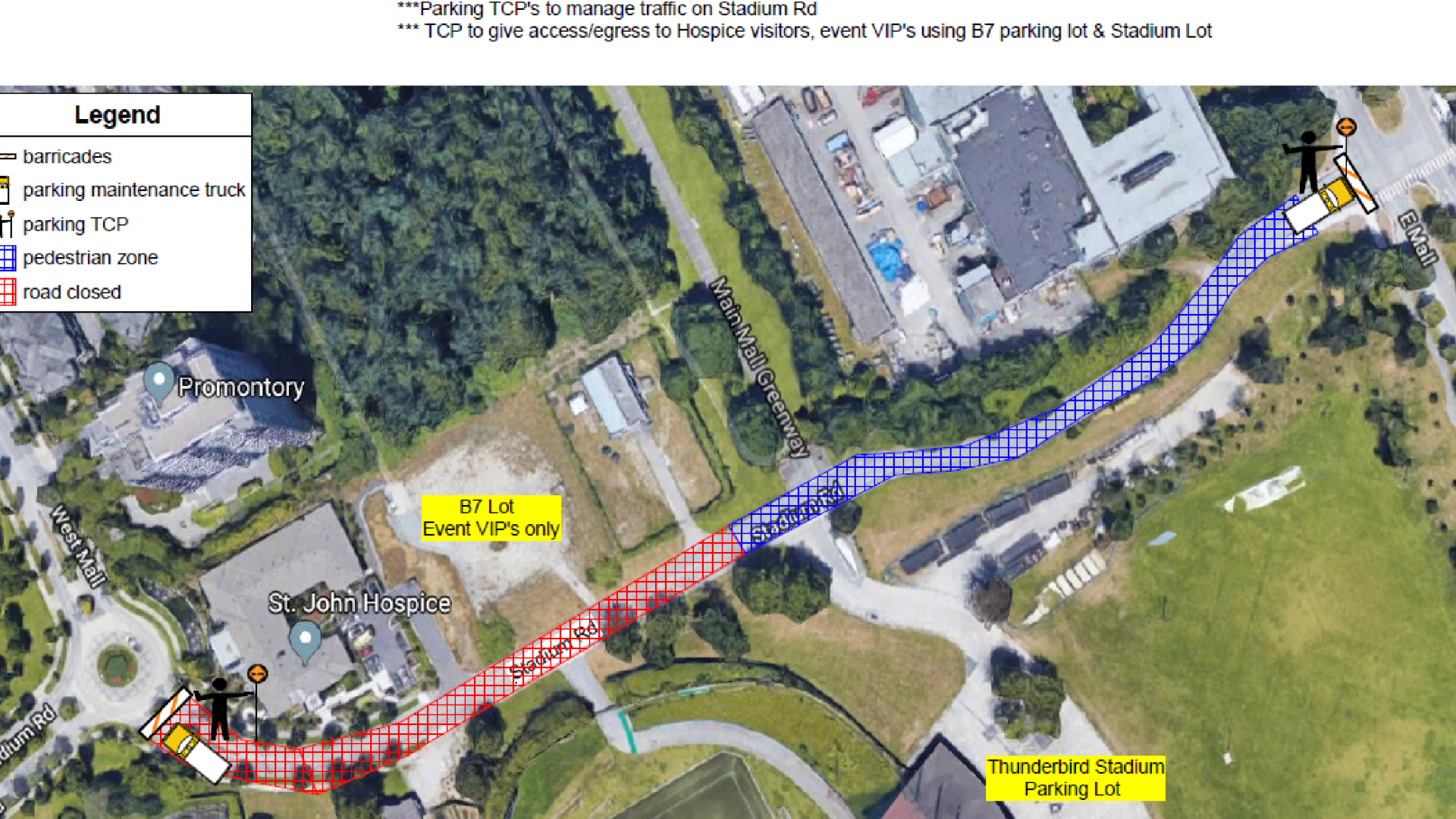 Stadium Road will be closed from East Mall to West Mall from 1 to 10:30 p.m. Access to Hospice to be maintained via West Mall. Access to stadium Road will be limited to VIP parking and vendors.