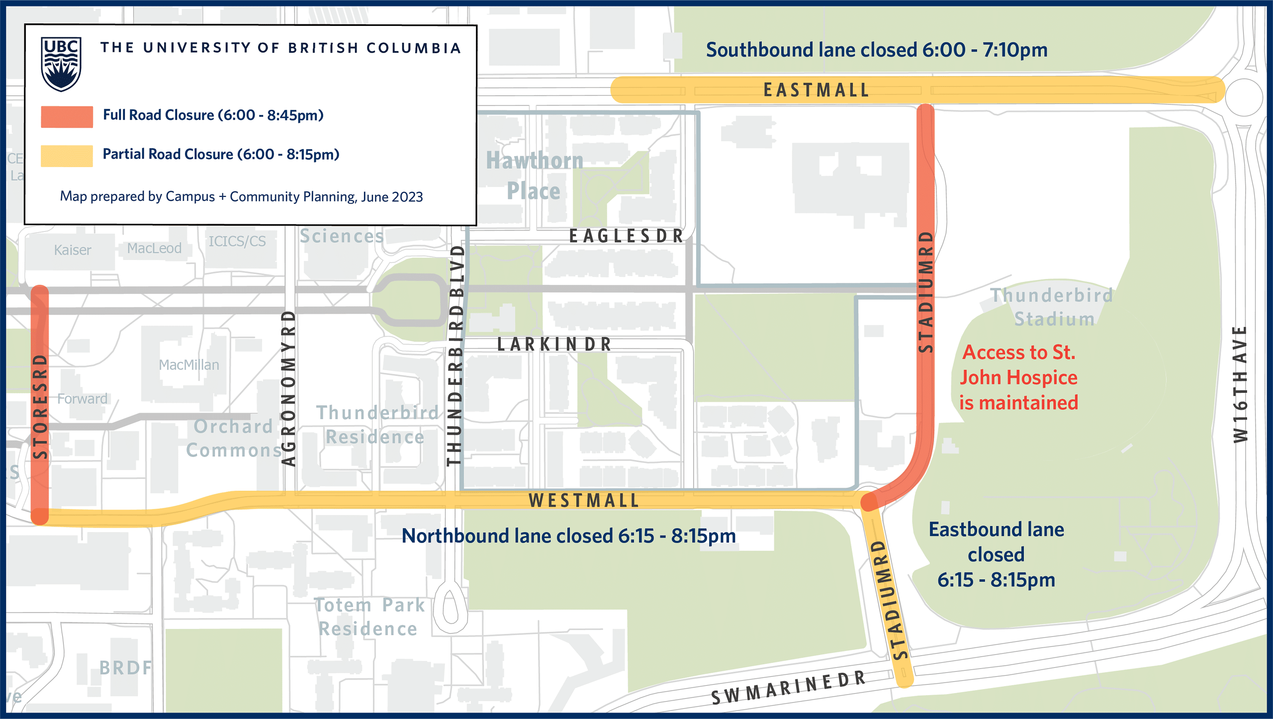 • Access to St. John Hospice will be via West Mall (not Stadium Road). During the event vehicles at the at the intersection of Stadium Road and West Mall will be stopped by traffic control and hospice visitors will need to identify themselves. Access will be permitted as quickly as possible.