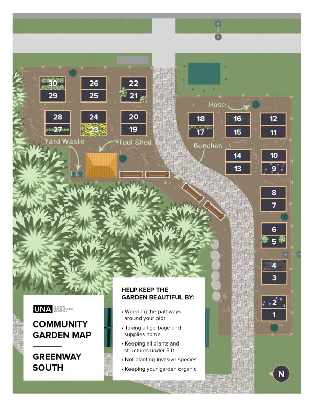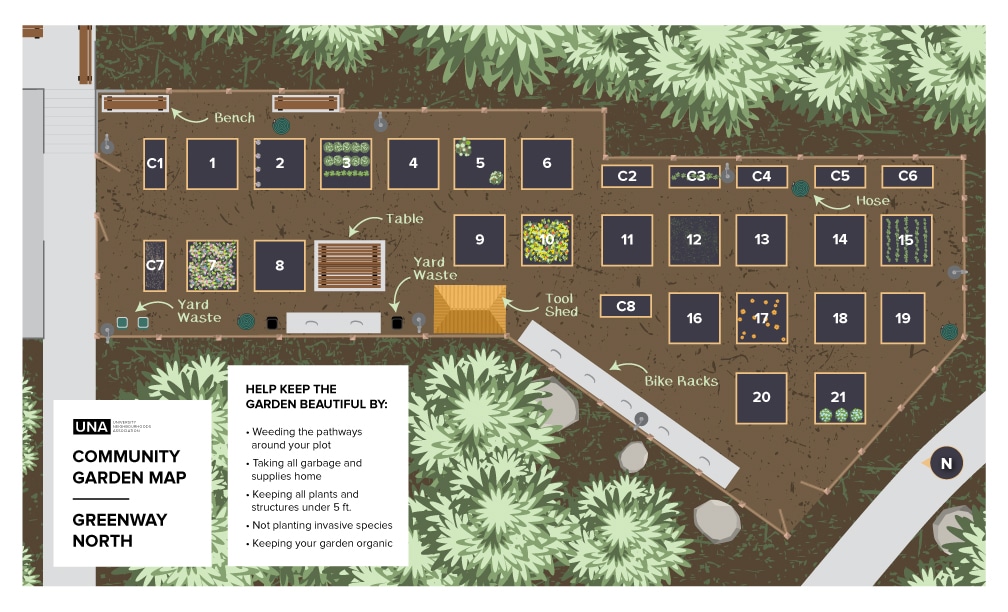 The community gardens are managed by the UNA, and supported by volunteer community garden committees.