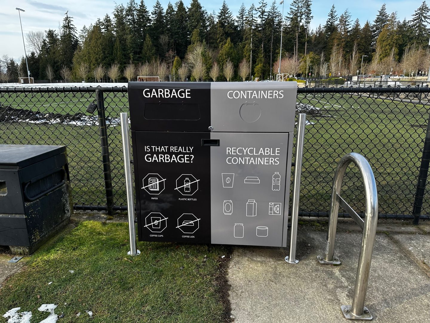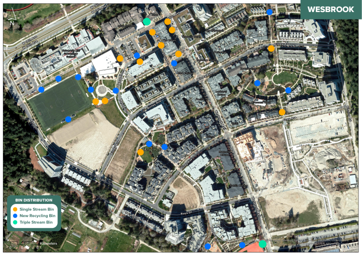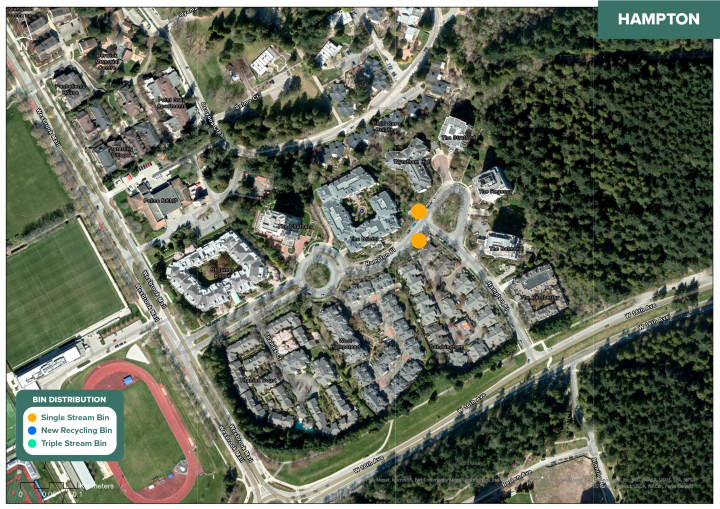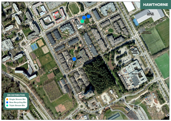 Triple stream bins that include paper recycling are also available in a couple of locations marked in green on the maps.