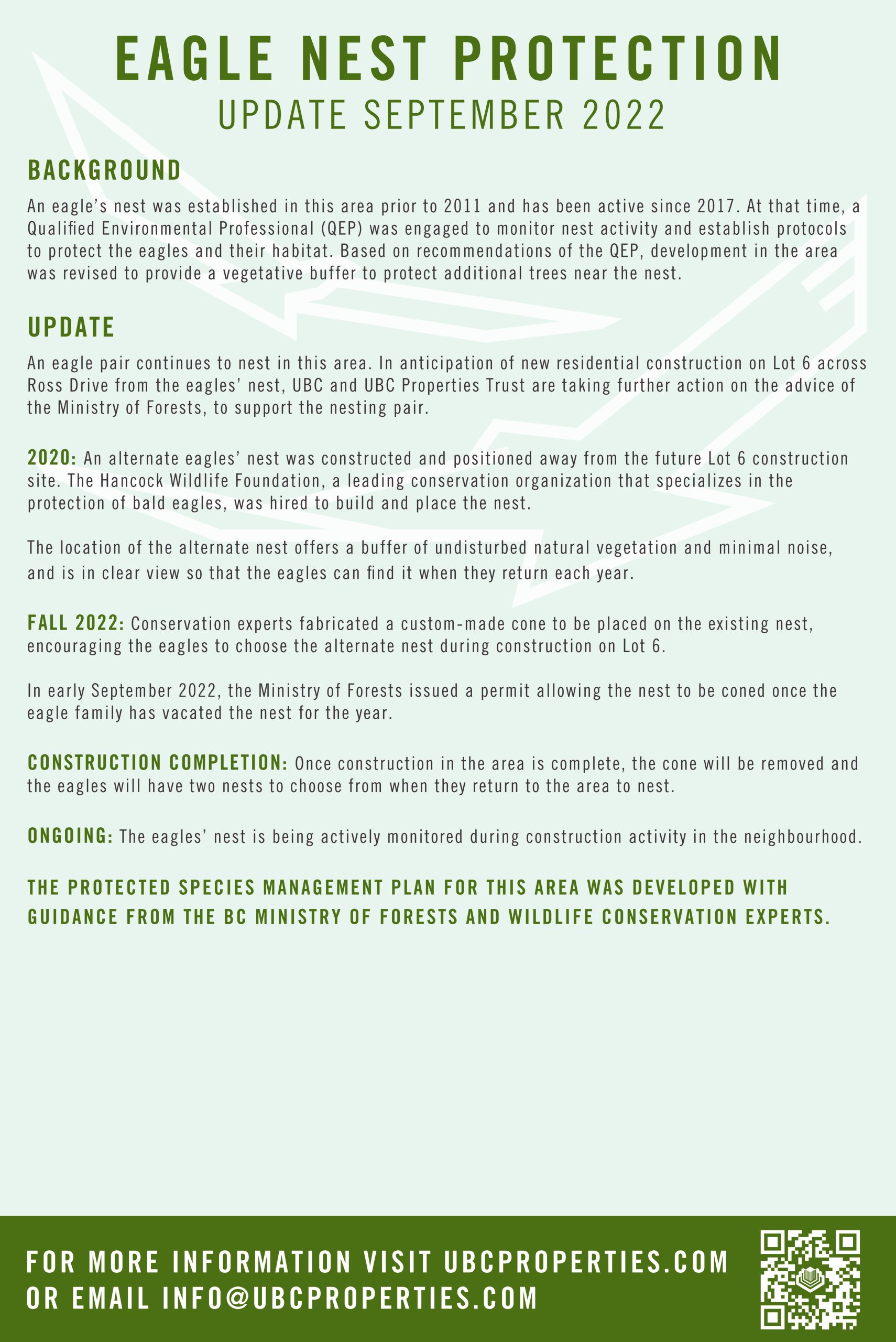 An eagle pair continues to nest in this area. In anticipation of new residential construction on Lot 6 across Ross Drive from the eagles’ nest, UBC and UBC Properties Trust are taking further action on the advice of the Ministry of Forests, to support the nesting pair.