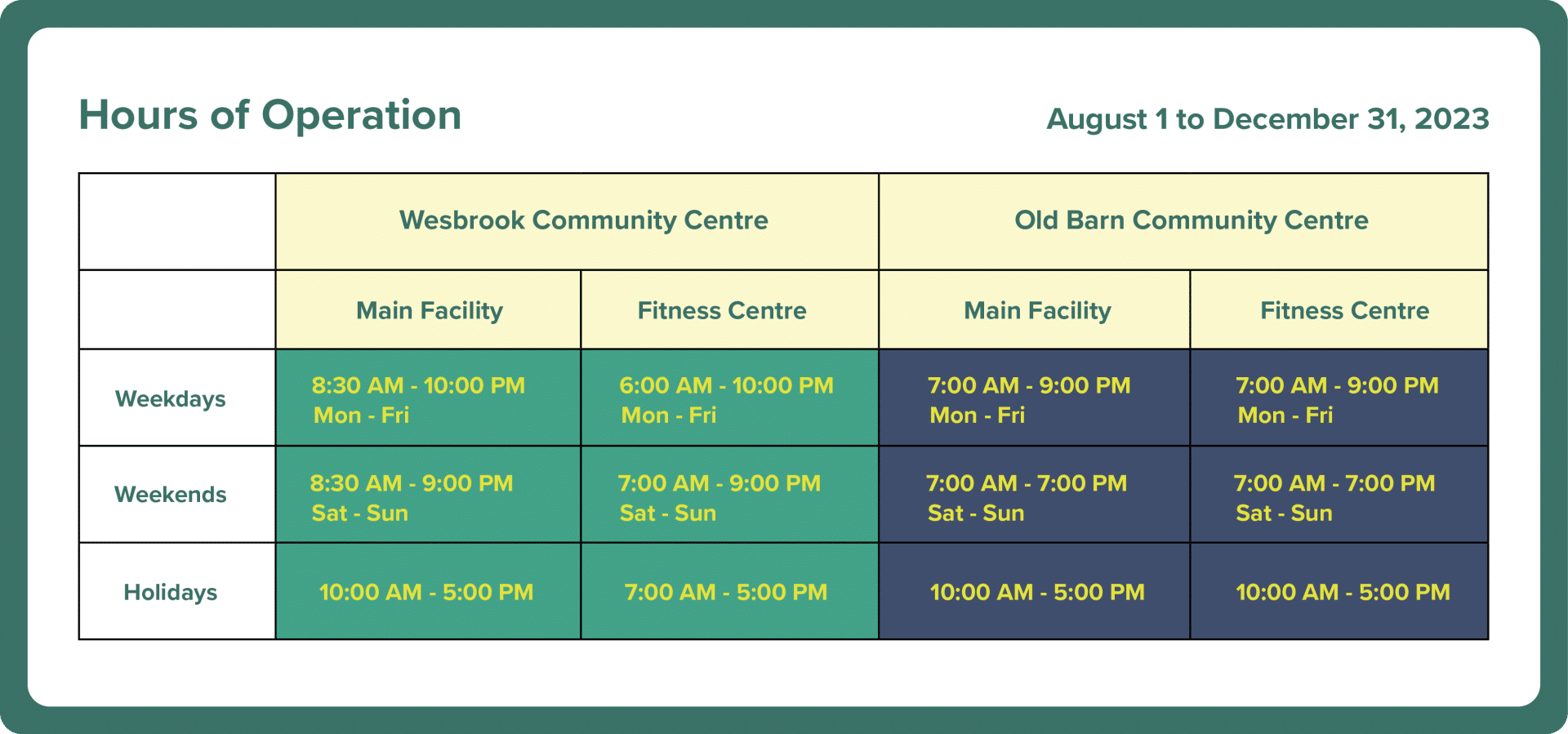 We will be implementing new hours of operation at Old Barn Community Centre and Wesbrook Community Centre starting from August 1 to December 31, 2023.